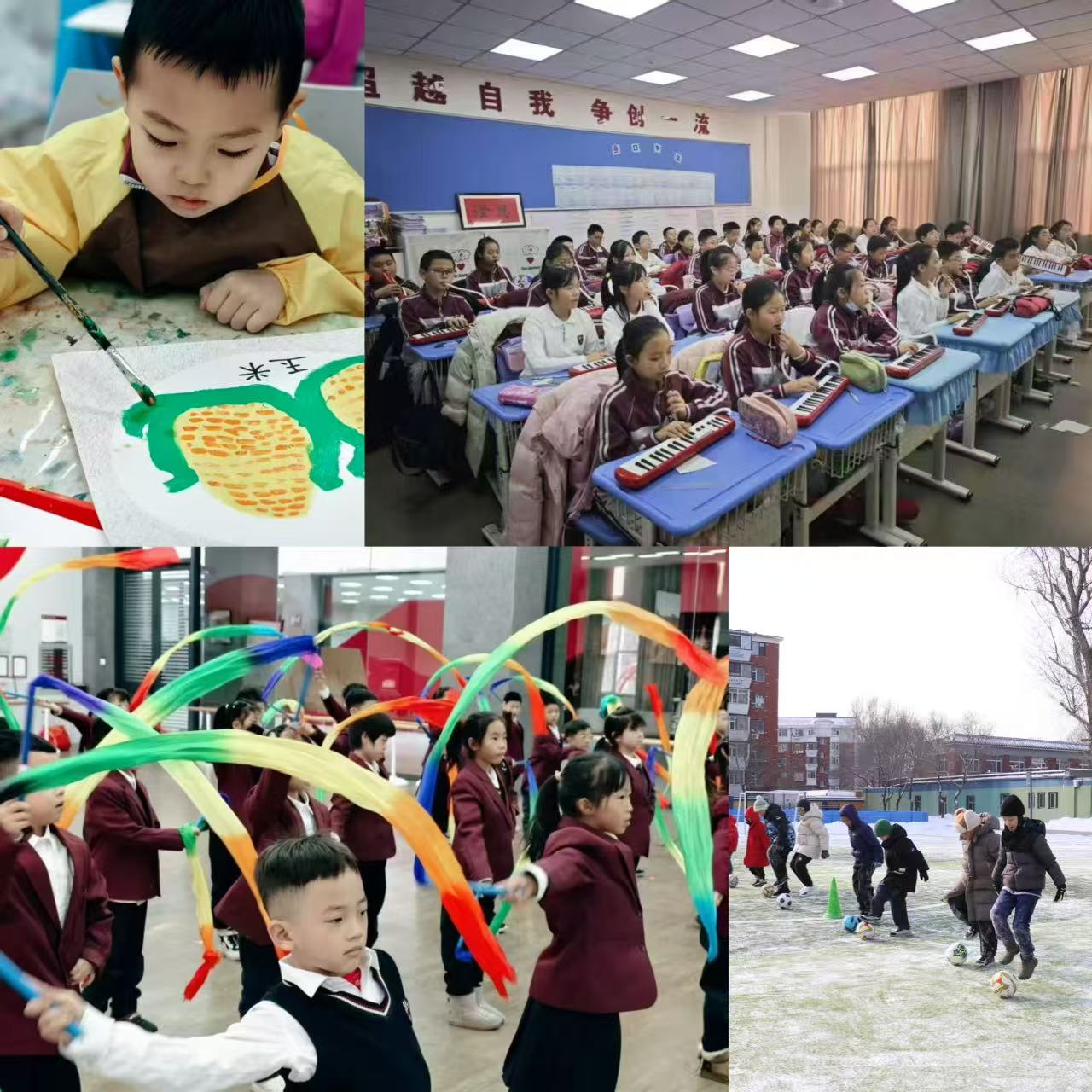 美术课堂里,水粉、水彩、版画课程联动,孩子们描绘冬日幻想、勾勒朦胧雪景,在雕刻压印间提升专注力与审美力。音乐课程百花齐放,彩带舞蹈翩跹灵动,竖笛、葫芦丝等乐器合奏悦耳,杯子舞更是充满欢声笑语,让学生在律动中感受艺术魅力。
