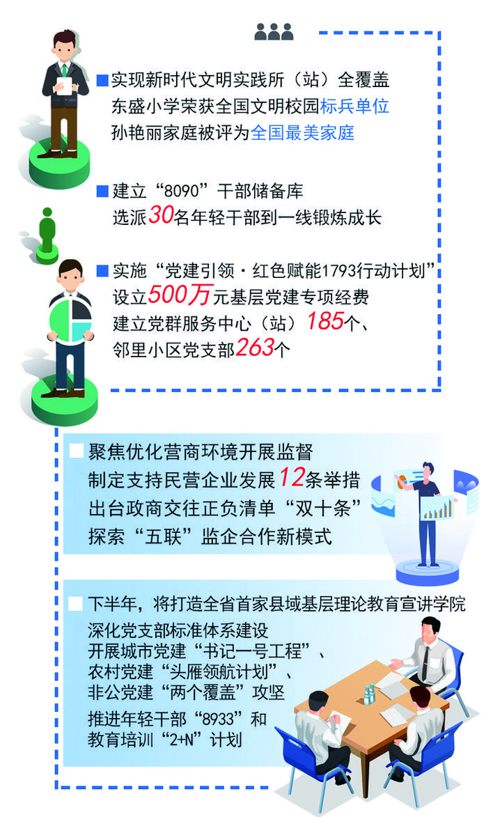 下半年,二道区将充分发挥党的组织优势和党建引领作用,推动党史学习教育常态化、长效化,抓好党的二十大和省、市党代会精神学习宣传贯彻,打造全省首家县域基层理论教育宣讲学院;贯彻“基层建设年”要求,深化党支部标准体系建设,统筹开展城市党建“书记一号工程”、农村党建“头雁领航计划”、非公党建“两个覆盖”攻坚,畅通“两委”晋升渠道,壮大基层工作力量;在急难险重任务中考察识别干部,从一线艰苦岗位中选拔使用干部,深入推进年轻干部“8933”和教育培训“2+N”计划;强化政治监督和营商环境监督,推进“一把手”和领导班子监督规范化、制度化、常态化,以“全周期管理”一体推进“三不腐”,以正气充盈的政治生态,为区域振兴发展提供坚强保障。