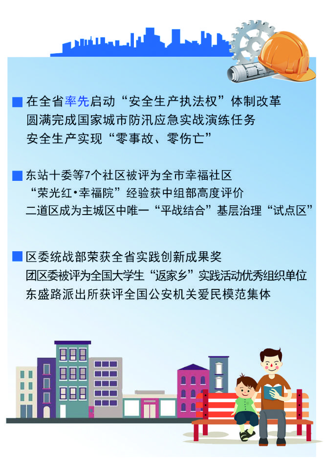 创新基层治理。试点打造社区便民服务站,东站十委等7个社区被评为全市幸福社区,“荣光红·幸福院”经验获中组部高度评价,二道区成为主城区中唯一“平战结合”基层治理“试点区”。
